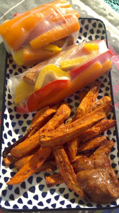 Groenten-tempehspringrolls met zoete aardappelfrietjes en pindasaus