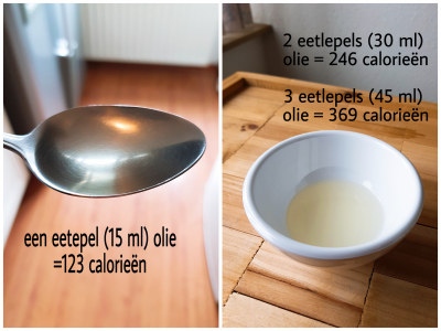 - Oliën bestaan volledig uit vet en bestaat grotendeels uit gezonde vetten en is een bron van vitamine E. Olijfolie is een grote favoriet en wordt veel gebruikt in de keuken om in te koken, maar ook als dressing voor in salades. Wel is het goed om te weten dat een eetlepel 123 calorieën bevat en eigenlijk is dit al voldoende om een maaltijd te bereiden of als ingrediënt voor in een dressing, maar in de praktijk wordt vaak het dubbele of meer gebruikt.