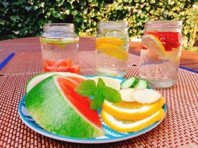Laat wat fruit, groenten en kruiden in je water trekken en voeg als laatste wat ijsblokjes toe voor een ice cold drink ☺- Komkommer, watermeloen, munt