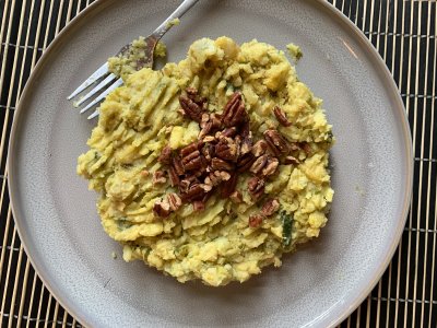 Spruitjes-stamppot kerrie, gember, appel, oude kaas