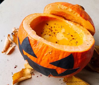 Halveer de pompoen in de lengte. Verwijder de schil, de zaden en de draderige binnenkant van de pompoen. Snijd het vruchtvlees van de pompoen in blokjes. Was de paprika, verwijder de zaadjes en snijd het in reepjes. Verhit de olie in een pan met een dikke bodem. Fruit de knoflook, ui, pili pili peper en het kerriepoeder ongeveer 2 minuten op middelhoog vuur. Voeg de pompoenblokjes en paprikareepjes toe en bak al omscheppend ongeveer 2 minuten. Voeg 1 liter water toe en voeg er het bouillonblok en de chilivlokken bij. Breng de soep aan de kook en doe er nog een snufje zout en peper bij. Laat het daarna op een laag vuur ongeveer 20 minuten zachtjes koken, vergeet niet goed tussendoor te roeren. Haal de pan van het vuur en pureer met de staafmixer tot een egale soep. Verdeel de soep in vier porties en schep in elke kom ongeveer een halve eetlepel creme fraiche.