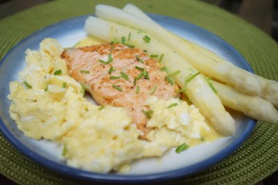 Vermeng het overgebleven eiwit met 2 eieren en wat zout en peper. Doe het mengsel met wat boter in een kleine koekenpan en zet de pan op een laag vuurtje. Roer regelmatig door met een schuimspaan totdat het ei gestold en gaat is. Schil de asperges zorgvuldig. Breng een ruime pan water aan de kook. Blancheer ze 6 minuten in kokend water en spoel ze daarna af met koud water om het garingsproces te stoppen. Bestrooi de zalmmoten met peper en zout en bak ze in 6-8 minuten gaar in wat hete boter. Serveer de asperges met de zalm en roerei overgoten met de hollandaisesaus.