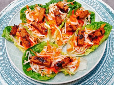 Aziatische kool-slawrap met gerookte kip/ tempeh