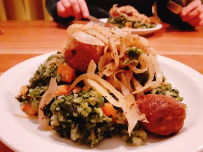 Boerenkoolstamppot met gekarameliseerde uien en vega balletjes