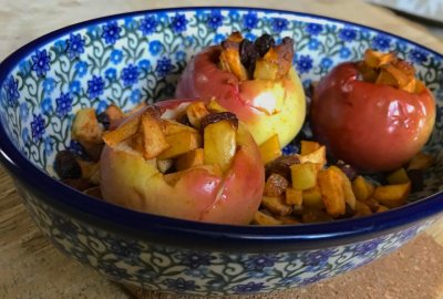 Vul de uitgeholde appels met het mengsel en strooi wat er over is aan de zijkanten van de appels in de ovenschaal.