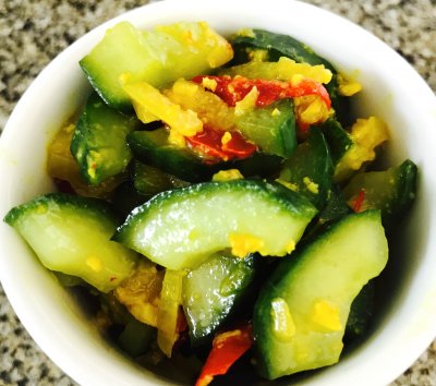 Halveer de pepers en verwijder de zaadlijsten en zaadjes en snijd ze in hele dunne reepjes. In een keukenmachine of vijzel de ui, knoflook, djahé, koenjit, kemiri noten en suiker tot een pasta malen. Doe een eetlepel olie in de pan en fruit het kruidenmengsel ca. 3 minuten. Voeg vervolgens de azijn en de rode pepers toe en laat dit even doorkoken en laat dit daarna afkoelen. Doe de komkommer in een schaal en giet het afgekoelde mengsel er overheen. Vind je de atjar te zuur dan kun je hem verdunnen met wat water.