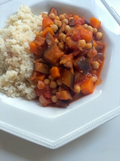 Was de aubergines, rasp de winterpeen schoon en laat de kikkererwten uitlekken. Snijd de aubergine in blokken (3 bij 3 cm) en de winterpeen in stukjes (1,5 bij 1,5 cm). Kook de wortelstukjes voor enkele minuten tot deze beetgaar zijn. Maak de knoflook en ui schoon en versnipper de ui. Verhit de olie in een grote pan en bak hier de ui in tot deze glazig is en voeg vervolgens de aubergine toe en pers hierboven de knoflook uit. Voeg de winterpeen toe als de aubergine rondom (licht) bruin is. Roer de gepelde tomaten, kikkererwten, komijn en chilipoeder door het aubergine mengsel. Breng dit aan de kook en zet vervolgens het vuur laag en laat het stoofpotje voor ongeveer 20 minuten pruttelen en schep dit af en toe om. Voeg eventueel een snufje zout en/of peper of een bouillonblokje toe. Kook ondertussen de zilvervliesrijst volgens de verpakking gaar. Giet de rijst af en serveer deze bij het auberginestoofpotje.