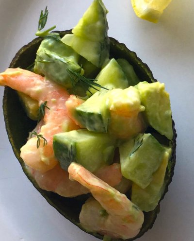 Halveer de avocado’s. Verwijder de pit en haal met een lepel het vruchtvlees eruit. Houdt de avocado schillen apart deze gebruik je later voor de opmaak. Snijd de avocado in blokjes en doe in een kom. Snijd vervolgens de komkommer in blokjes en mix samen met de avocado en garnalen. Pers de citroen uit over de kom en meng samen met de dille, een flinke eetlepel, mayonaise en zout er peper naar smaak. Vul de uitgeholde avocado’s met de salade en top af met wat extra dille.