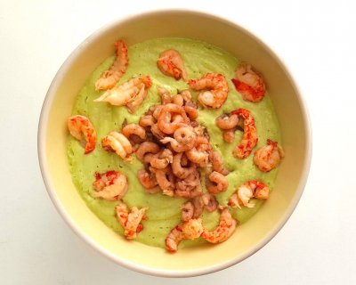 Schil de komkommer en snijd de avocado in tweeën. Schep het vruchtvlees eruit en leg terzijde. Snijd de overige groenten in grove stukken. Giet de avocado en de olie in de blender, samen met de yoghurt en het limoensap. Voeg het chilipoeder, de peterselie, komkommer, knoflook, avocado, bleekselderij en sjalot toe aan het yoghurtmengsel. Zet de blender aan op een lage stand. Alle stukken moeten worden fijngemalen in de blender. Schep de soep in een grote kom en voeg naar smaak peper en zout toe. Om de soep af te maken garneer je het met de garnalen.