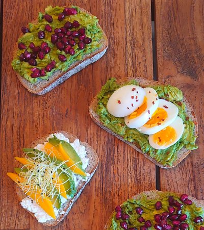- Beleg twee volkoren boterhammen met 1/2 gesmashte avocado + 2 eetlepels granaatappelpitjes.