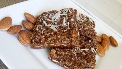 Vet een bakvormvan circa 23 cm in. Een brownievorm werkt prima. Er kan eventueel bakpapier worden gebruikt. Mix de amandelen op de hoogste snelheid voor ongeveer een minuut in de blender of met een staafmixer. Voeg daarna de kardemom toe en maal dit kort voor 30 seconde mee. Neem een steelpan en doe hier de suiker en het water in. Verhit dit mengsel terwijl je roert. Op het moment dat het mengsel begint te koken voeg je de gemalen amandelen toe. Blijf goed roeren op laag vuur totdat je een dikkere substantie krijgt. Haal de pan van het vuur, laat het afkoelen en stort het mengsel in de bakvorm. Zet het in de koelkast om te laten opstijven voor circa 5 uur. Snijd er vervolgens vierkante stukken uit. Garneer de burfi met wat gehakte noten. Normaliter wordt tijdens de bereiding van de burfi gebruik gemaakt van melkpoeder, suiker, volle melk en ghee (geklaarde boter). Dit recept is een stuk minder calorierijk. Eet Smakelijk! स्वादिष्ट भोजन