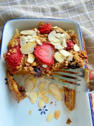 Verwarm de oven voor op 180 graden. Meng alle ingrediënten in een blender en voeg het mengsel toe aan een ovenbestendig schaaltje. Verdeel de garnering eroverheen (rood fruit en amandelen). Plaats in de oven en bak binnen 30-40 minuten goudbruin aan de bovenkant.