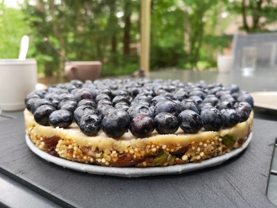 Laat de cashewnoten en dadels een uurtje weken in 2 aparte schaaltjes. De geweekte cashewnoten en dadels heb je nodig wanneer je straks echt begint met het recept. Gooi het water na een uurtje weg. Smelt de roomboter in een steelpannetje en roer de havermout er doorheen. Laat even afkoelen. Pak een grote (meng/ kneed)kom en doe daar de geweekte dadels, rozijnen en de gepofte quinoa in. Hak de noten grof op een snijplank en voeg ook deze toe aan de kom. Voeg ook het havermoutmengsel toe. Kneed met je handen tot alles goed gemengd is. Bekleed een taartvorm met bakpapier en druk het deeg plat op de bodem. Doe de het citroensap, de honing en een klein scheutje water in de blender en voeg daarna de geweekte cashewnoten toe. Blend/ mix een paar minuten met een goede staafmixer tot een glad mengsel. Voeg nog een klein beetje water toe als het te dik wordt om te mixen. Verdeel de cashewcreme over de taartbodem en strijk glad met een natte lepel. Zo blijft de lepel niet plakken aan de cashewcreme. Laat de taart 1 uur opstijven in de koelkast. Versier naar hartenlust met bessen!