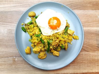 Voeg hierna de prei, bloemkool en taugé toe. Strooi meteen het koriander, laos, kurkuma, gemalen komijnzaad, gemberpoeder, peper en zout erover en roer heel goed door. Schep als laatste de sperziebonen door de nasi. Bak het ei in de pan en serveer deze op het gerecht.