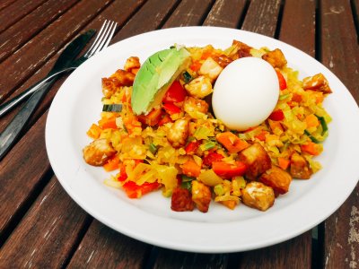 Snipper de ui en knoflook. Was de groenten en snijd vervolgens de prei, paprika en wortel in kleine stukjes. Zet een grote wokpan met olie op laag vuur en fruit de ui en knoflook in 2 minuten. Voeg daarna de rest van de groenten toe. Zet een steelpannetje op het vuur en breng water aan de kook voor de eieren. Doe de 2 eieren in het steelpannetje en gooi er kokend water overheen tot ze onder water staan. Kook in 5-8 minuten zacht- of hard gekookt. Verhit olijfolie in een aparte koekenpan en roerbak de tempehblokjes 3-4 minuten op matige temperatuur. Regelmatig keren. Was en snijd ondertussen de bloemkool zo fijn mogelijk. (als ‘’rijstkorrels’’) Wok de bloemkoolrijst in de wokpan bij de andere groenten in 2 minuten beetgaar. Laat de eitjes schrikken onder koud water en pel ze. Schep 2 borden lekker vol met al dit lekkers.
