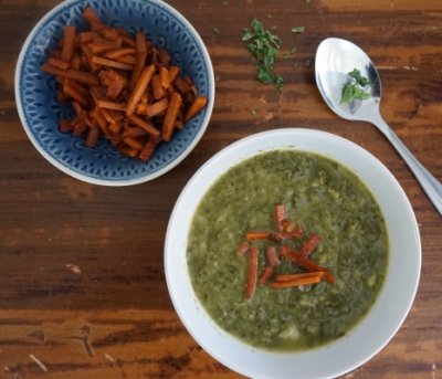 Was en snij de boerenkool, aardappelen, knolselderij en ui. Verhit de olijfolie in een braadpan en bak de vegetarische spekjes tot bruin zijn. Schep ze uit de pan op een bordje. Fruit de ui in hetzelfde bakvet zachtjes glazig. Schep de aardappelblokjes en boerenkool en knolselderij door de ui en schenk het water erbij. Voeg bouillonpoeder toe. Breng het geheel aan de kook. Kook de soep in 20 -30 minuten zachtjes gaar. Pureer de soep met een staafmixer tot hij een grove structuur heeft. Serveer met de spekjes. Breng op smaak met zout en (versgemalen) peper.