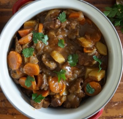 Laat de runderlappen eerst op kamertemperatuur komen. Schil de aardappelen en de winterpenen en snijd ze in plakjes. Veeg de champignons schoon met een papieren doekje en snijd deze in plakjes. Schil de uien snijd deze in ringen. Schil de knoflook en snijd deze in plakjes. Doe de bloem met het zout en peper in een schaal. Snijd het ontbijtspek in klein stukjes. Snijd de runderlappen in blokjes. Kook het water alvast in de waterkoker en vermeng deze in een beker met het bouillonblok. Vermeng de blokjes vlees in de schaal met bloem, zout en peper zodat het vlees helemaal bedekt is. Verhit een ruime (koeken)pan met dikke bodem op het vuur. Doe een scheut (2 eetlepels) olie in de pan en bak hierin het spek enkele minuten en haal dit vervolgens uit de pan en leg op een bordje. Doe een klein scheutje (1 eetlepel) extra olie in de pan en bak het vlees hierin aan totdat het dichtgeschroeid is aan alle kanten. Haal het vlees uit de pan en laat even rusten op een bord met een stuk folie erover. Bak vervolgens de knoflook en uien enkele minuten. Doe vervolgens de aardappel en wortelen erbij en bak deze even mee. Doe nu de bouillon, wijn, tomatenpuree, laurier, peterselie, ontbijtspek en vlees erbij. Breng aan de kook en laat het geheel minimaal 3 uur stoven op een zacht vuurtje. Bak de champignons en voeg deze op het eind toe. Serveer met bijvoorbeeld sperzieboontjes of broccoli en eventueel stokbrood en aardappelpuree.