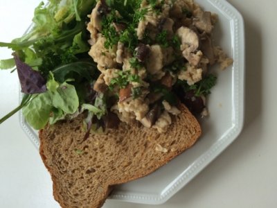 Broodje roerei met champignons en salade