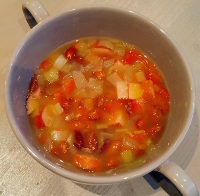 Breng 500 ml water aan de kook met het runderbouillonblokje, het laurierblad en de kruidnagel. Maak ondertussen de prei en paprika schoon en snijd deze in blokjes en snipper de ui. Laat de de bruine bonen uit pot/ blik uitlekken en spoel deze af in een vergiet tot ze niet meer schuimen. (gedroogde bruine bonen gebruiken kan ook, houdt er rekening mee dat deze dan eerst 12 tot 24 uur moeten weken). Als de bouillon kookt, voeg dan de bruine bonen* toe. Snijd ondertussen de verse worst in blokjes. Voeg, nadat de bonen 5 minuten minuten zachtjes gekookt hebben, de prei, paprika, ui en de verse worst in één keer toe. Laat dit 10 minuten zachtjes doorkoken en roer regelmatig. Haal vervolgens de laurierblad en kruidnagel uit de soep en schep deze op.