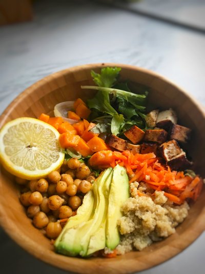 Verwarm de oven voor op 200 graden. Mix alle ingrediënten voor de marinade in een apart kommetje en voeg toe aan de tofu. Laat dit afgedekt in de koelkast minimaal een half uurtje marineren. Schil de zoete aardappel en snijd in blokjes. Snijd de ui in halve ringen en leg deze samen met de blokjes zoete aardappel en twee fijngehakte teentjes knoflook op een bakplaat. Besprenkel met een eetlepel olie en peper en zout naar smaak, daarna 20 minuten bakken. Terwijl dit in de oven staat kun je de quinoa koken volgens de bereidingswijze op de verpakking. Breng in een kommetje de kikkererwten op smaak met de chili- en knoflookpoeder en peper en zout naar smaak. Bak ze in een pan ongeveer 10 minuutjes tot ze gaar zijn. Als de kikkererwten gebakken zijn, zet je deze vast aan de kant. Bak dan de tofu ongeveer 10 minuten. Voor het opmaken van de bowls leg je eerst onderop de sla. Snijd de gebakken tofu in blokjes en verdeel deze samen met de overige groenten, avocado, kikkererwten en quinoa over de sla heen. Als frisse dressing besprenkel je de bowls met citroensap. Eet smakelijk!