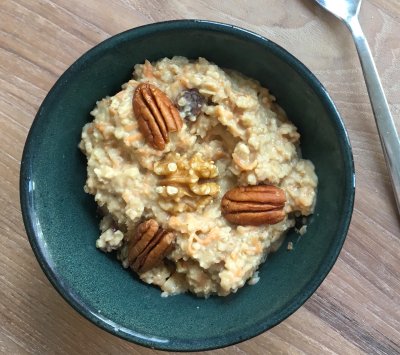 Verwarm de havermout met amandelmelk in een steelpannetje en rasp hierboven de wortel. Laat de havermout op middelhoogvuur voor enkele minuten pruttelen maar blijf goed roeren. Als het geheel naar wens is voeg je de lijnzaad, rozijnen, pecannoten en kruiden toe en roert het geheel goed door. Doe de havermout in de kommetje en garneer met pecannoten.