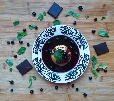 Appel uit de oven met bosvruchten, champagne, munt en chocoladesaus
