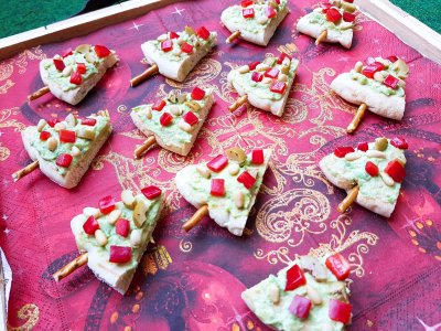 Kerstboompjes met avocadospread en toppings