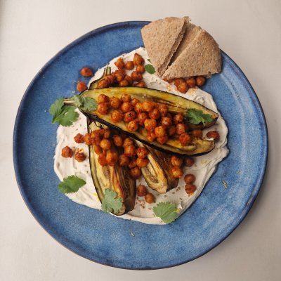 Tahin-labneh met aubergine en harissa kikkererwten