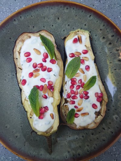 Geroosterde aubergine met frisse yoghurtsaus en pijnboom- en granaatappelpitjes