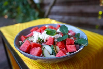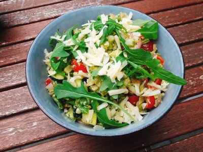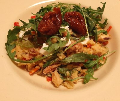 Stamppot rucola en romainesla met vijgen en noten
