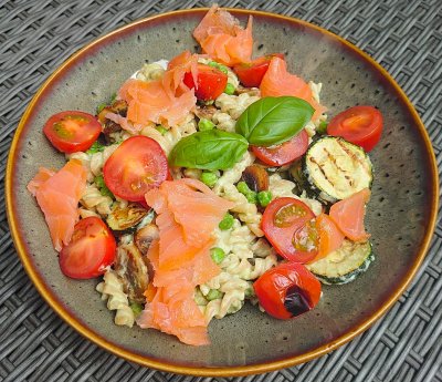 Pasta met avocado-basilicum saus, gegrilde groenten en gerookte zalm