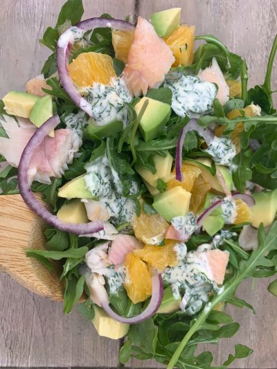 Salade met gerookte forel, sinaasappel, rucola en dille