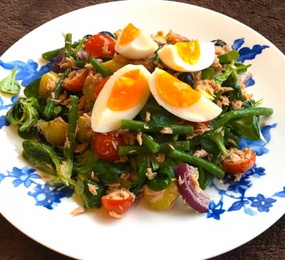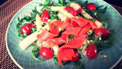 Zomerse maaltijdsalade met zalm, asperges en heerlijke dressing