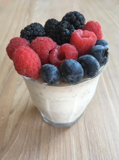 Vermeng de banaan, kwark, chiazaad en theelepel kaneel 20 seconden in de blender. Verdeel dit mengsel over twee glaasjes (of een weckpot voor on the go), dek deze af en zet in de koelkast. De volgende ochtend hoef je enkel het fruit nog toe te voegen en smullen maar.
