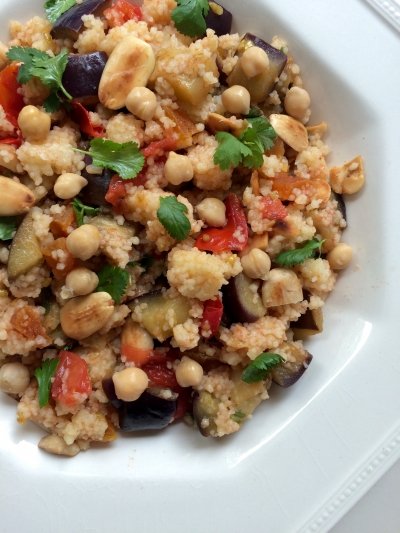 Couscoussalade met aubergine, kikkererwten en amandelen
