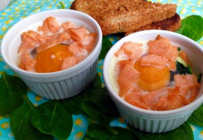Verwarm de oven voor op 200 °C. Verhit een koekenpan zonder olie of boter en laat hierin de spinazie slinken. Pers de knoflook erboven en roer erdoor. Doe de spinazie in een zeef en duw er met een lepel zo veel mogelijk vocht uit. Leg op een snijplank en snijd fijn. Doe terug in de zeef en duw weer met de lepel vocht eruit. Verdeel de spinazie over de ovenschaaltjes. Breek boven elk schaaltje een ei. Snijd de zalm in reepjes en verdeel erover. Verdeel een snufje peper over de schaaltjes. Zet de schaaltjes in een braadslee of ovenschaal en schenk er zo veel lauw water bij, dat de schaaltjes half onder staan. Zet de braadslee 15 minuten in de oven, tot het eiwit net gestold is. Serveer met brood.