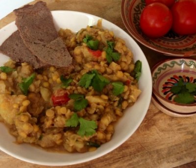 Schil en snijd de zoete aardappelen in niet al te kleine blokjes. Schil en snipper de ui en de knoflook. Snijd de kool in dunne reepjes en was deze. Was en snijd de tomaten in achten. Kook water en maak de bouillon klaar. Doe een scheut olie in een grote pan en bak de ui en de knoflook glazig. Voeg dan 1/2 - 1/3 van de kruiden toe plus de gember, en bak even mee. Voeg de kool toe en bak deze ca 4 minuten mee. Voeg de tomaten toe en roer alles om. Voek de stukjes aardappel, de spliterwten en de bouillion toen. Laat lekker pruttelen voor zo/n 45 minuten op een zacht vuurtje.