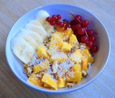 Lepel 250 ml magere kwark in een kom en strooi daar het lijnzaad over. Snijd het fruit in de gewenste grootte en voeg die aan de kwark toe. Om het geheel af te maken strooi je de gehakte walnoten en de kokos erover heen. Smakelijk eten!