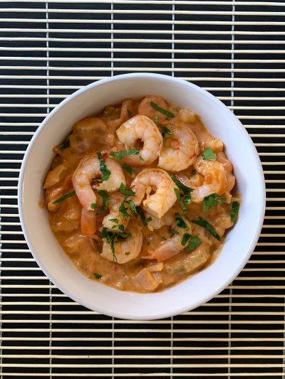 Snijd de ui, wortel, bleekselderij, venkel en tomaat in fijne ringen/ schijfjes/ blokjes (groente eerst goed afspoelen met koud water). Verhit een pan en doe daarin de olijfolie (een flinke eetlepel) en roerbak al groente, behalve de tomaat, een minuut of 5. Doe daarna de tomaat en tomatenpuree erbij en bak deze ook even mee. Voeg vervolgens het water en bouillonblok toe, breng aan de kook en laat op een laag vuur een minuut of 10 koken (het is lekker als de groente een 'bite' behouden). Snipper een teen knoflook en bak de gamba's in een klein beetje olie, met een theelepel sambal en de knoflook, enkele minuten (let op: ze zijn al gaar en te lang verhitten maakt ze taai) en zet de hittebron uit. Laat in een andere pan de boter smelten op een laag vuur en doe daar de bloem bij, roer goed door elkaar (dit heet een'roux' en hierdoor gaat je de soep binden). Doe dan de soep in de pan met de roux, breng zachtjes aan de kook terwijl je goed roert, je merkt nu dat de soep wat dikker wordt. Voeg een scheutje room toe en roer goed door. Serveer de soep met de gamba's en verse peterselie.