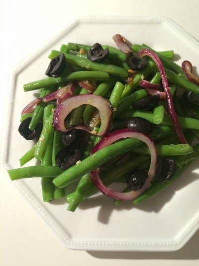 Was en maak de sperziebonen schoon. Kook of stoom de sperziebonen voor ca. 10 minuten tot ze beetgaar zijn.Maak de ui schoon en snijd in dunne ringen en snijd de olijven in ringetjes.