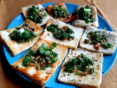 Gegrilde halloumi met walnoten, bosui, peterselie en honing