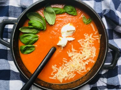 Geroosterde tomaten-paprikasoep met basilicum, pijnboompitjes en Parmezaanse kaas