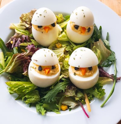 Maak een bedje van gemengde sla op een diep bord. Vul de eieren voorzichtig met het mengsel en zet de hoedjes erop. Gebruik de driehoekige wortels als snavels en de olijfblokjes als ogen en maak een gezichtje, zoals op de foto.