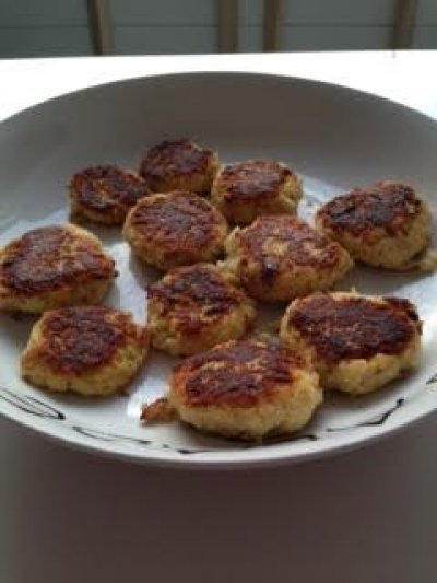 Kneed hiervan 12 koeken. Bak ze op laag vuur aan beide kanten in olijfolie tot ze licht bruin zijn.