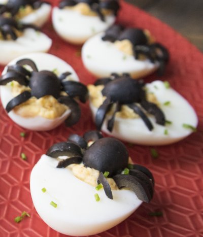 Snijd de eieren over de lengte doormidden, lepel het eigeel er voorzichtig uit en doe deze in een kommetje. Voeg daar de mayonaise, paprika-, kerrie- en ui poeder aan toe en prak alles tot een smeuïge massa. Voeg zout en peper naar smaak toe. Doe het mengsel in een spuitzak en vul daarmee de eieren. Neem één olijf per spin en snijd deze doormidden. Gebruik één helft van de olijf voor het lijfje van de spin. Snijd de andere helft van de olijf in 8 dunne reepjes voor de pootjes van de spin.