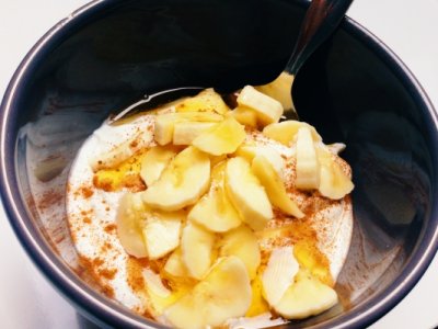 Verdeel de hangop over 2 schaaltjes.Doe in elk schaaltje een halve banaan in stukjes.