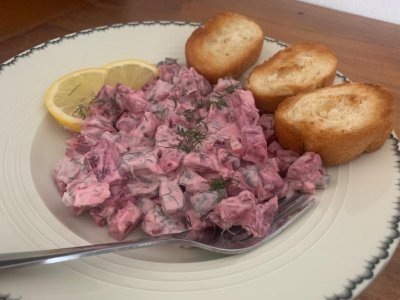 Schil (zonodig) en snijd de bietjes in blokjes. Snijd de augurken in schijfjes. Snipper de (halve) ui. Half de dille fijn. Vermeng de mayonaise met de creme fraiche, gehakte dille en het sap van 1/2 citroen. Snijd de haringen in stukjes. Vermeng alle ingredienten door elkaar. Serveer met brood of zonder, als (low carb) maaltijdsalade.