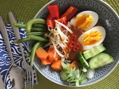 Zet het water op het vuur en breng aan de kook. Voeg de pindakaas toe en klop met de garde tot een gladde massa. Voeg daarna alle ingredienten toe en laat nog even inkoken. Klaar ben je!