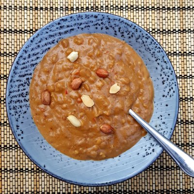 Snipper de sjalotjes en snij de knoflook, de gember en de halve rode peper fijn. Verwarm de olie in een diepe steelpan en fruit de sjalotjes. Voeg vervolgens de knoflook, gember en rode peper toe. Roer de pindakaas, de kokosmelk en de kruiden er doorgeen en verwarm het geheel al roerend (niet laten koken!). Wanneer de saus dikker is geworden voeg je de ketjap manis en sambal toe, en neem je de pan van het vuur.