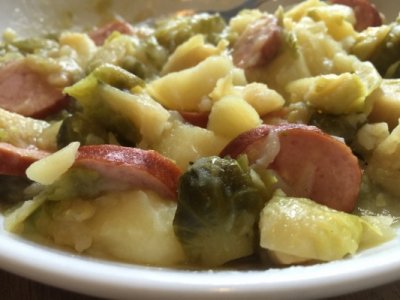 Schil en snijd de ui in ringen. Maak de spruitjes schoon en halveer deze. Schil de aardappelen en snijd deze in stukjes. Zet een grote (hapjes)pan op het vuur en laat deze heet worden. Voeg vervolgens de olie of boter toe. Als deze op temperatuur is, voeg de uien toe en bak deze enkele minuten. Voeg vervolgens de aardappel en spruiktjes toe en bak deze kort mee. Voeg nu het water en bouillonblok toe en breng aan de kook. Doe dan de laurierblaadjes erbij. Snijd de rookworst in plakes en doe deze er ook bij. Laat dit zachtjes koken tot alle ingredienten goed gaar zijn en de aardappel de hussel bindt. Doe als laatste de zwarte peper erover naar smaak.